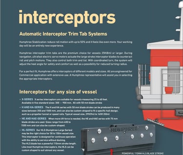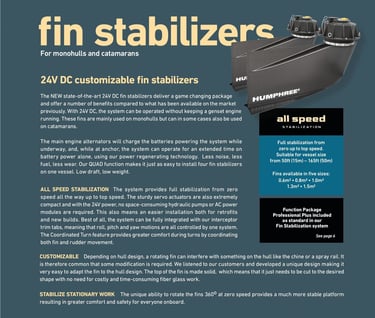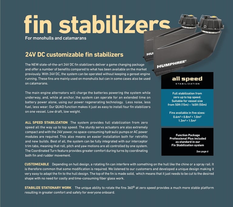 Our electric fin stabilisation system will stabilise your boat at anchor and throughout the whole speed range with unique performance also during turns integrated with the steering of the boat. fte integration of interceptors and fin stabilisers will provide an exclusive ability to control your vessel with comfort and safety no matter if you are at anchor or at speed.