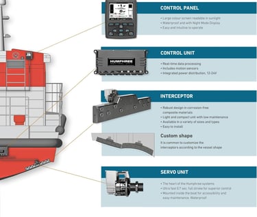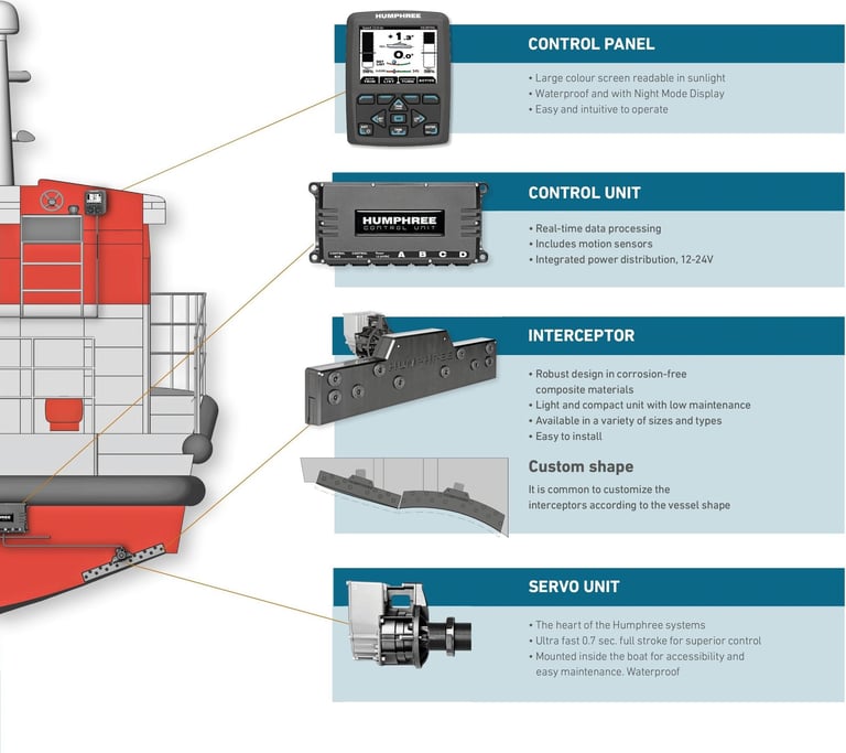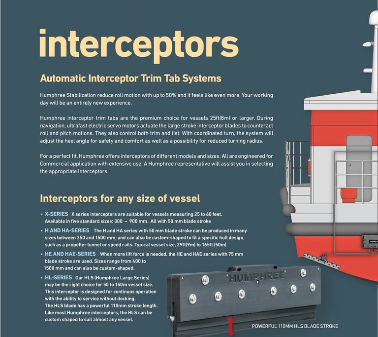 For planing and semiplaning monohull and catamaran vessels, our interceptor based stabilization systems will make you experience less roll and pitch motions, better performance, lower fuel consumption and safe comfortable turns. fte interceptor trim tabs provides the most efficient trim and stabilisation system on the market.