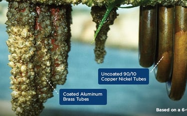 This image illustrates a comparison between traditional aluminum brass tubes with hard baked coating (left side) and uncoated 90/10 copper-nickel tubes (right side). It’s the result of a six weeks feasibility test. The high copper content of the tubing provides natural anti-fouling capabilities, offering protection against marine growth. Copper alloys possess an inherent natural resistance to biofouling. Clearly, the 90/10 Cu-Ni alloy is resisting fouling from algae mussels and other marine growth. For clarification, the biofouling resistance of copper alloys is due to the copper in the protective oxide film; it is not from the leaching of copper ions.